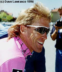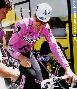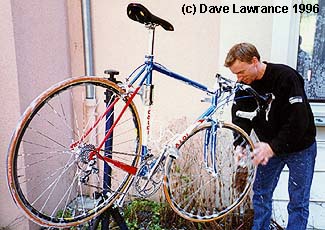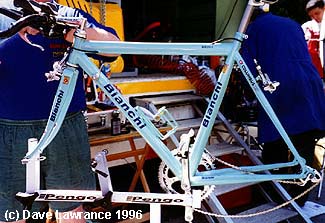 Berzin's mountain time trial bike. | Max Sciandri's bike gets a wash. |