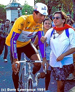 Miguel Indurain leaves the Champs Elysees shortly after winning his first Tour de France in 1991. |