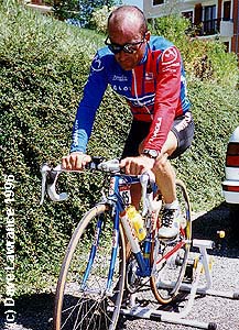 Alex Zulle prepares to ride the turbo trainer. Note the amount of clothing, despite the hot day. |