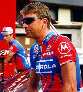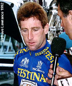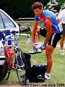 Phil Anderson dons his racing shoes before the mountain stage to Luz Ardiden. | Sean Yates contemplates a tough day in the Pyrenees. |
